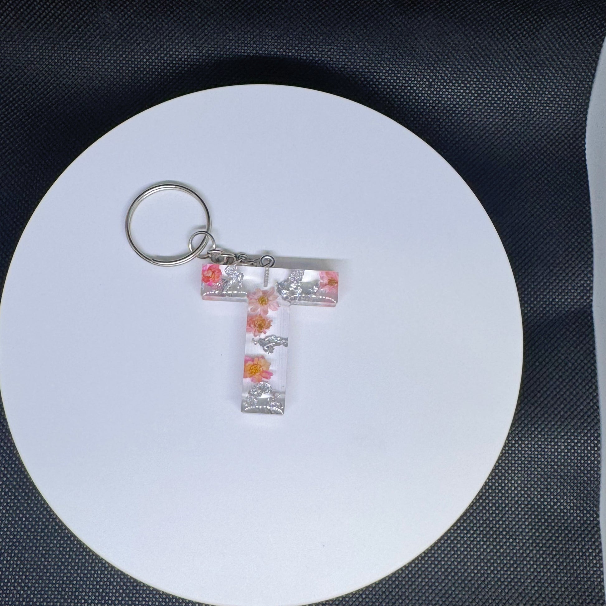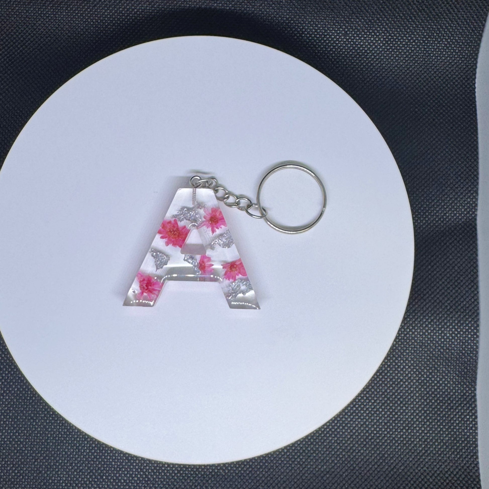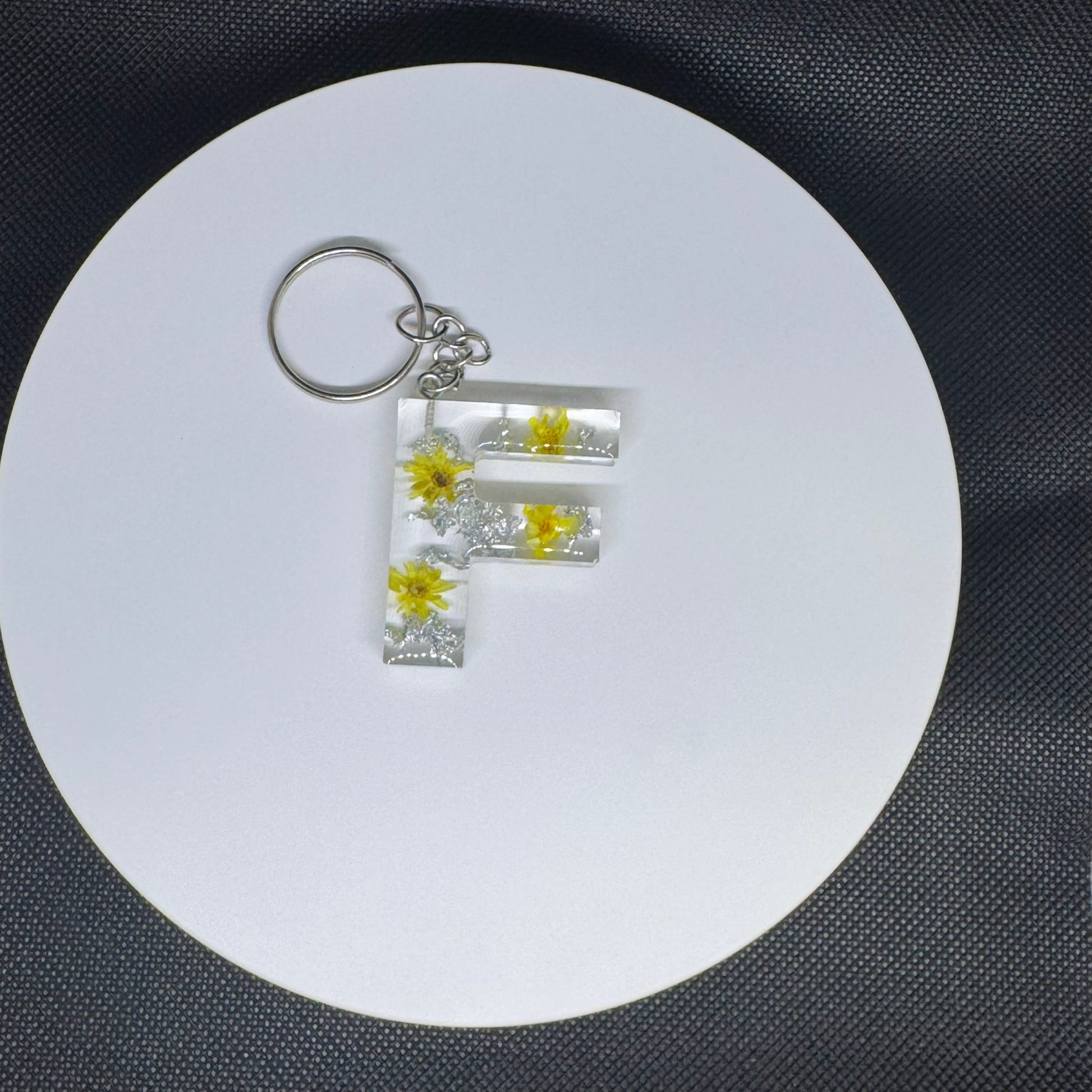 Alphabet letter keychain with flowers and silver foil